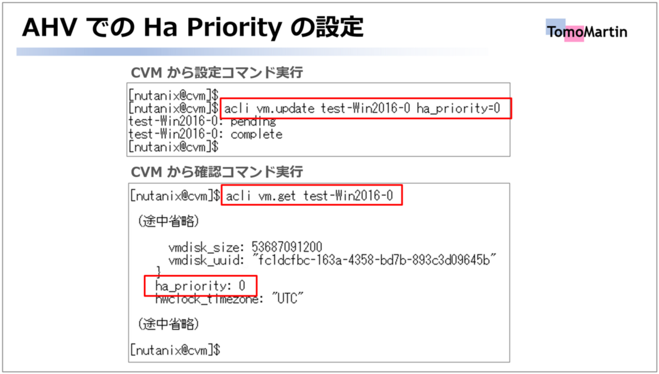 acli vm.update VMの名前 ha_priority=値