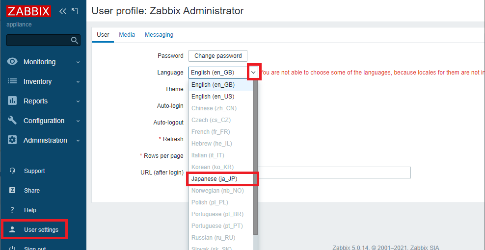 その後、User settings > Profile > UserのTime zoneをAsia/Tokyoに変更します。